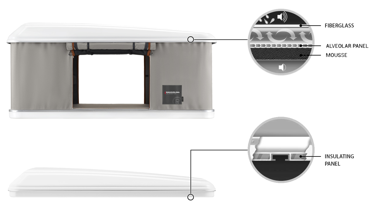 Impiegando poliestere e fibra di vetro, come gli scafi delle migliori imbarcazioni, la tenda da tetto Maggiolina non invecchia,